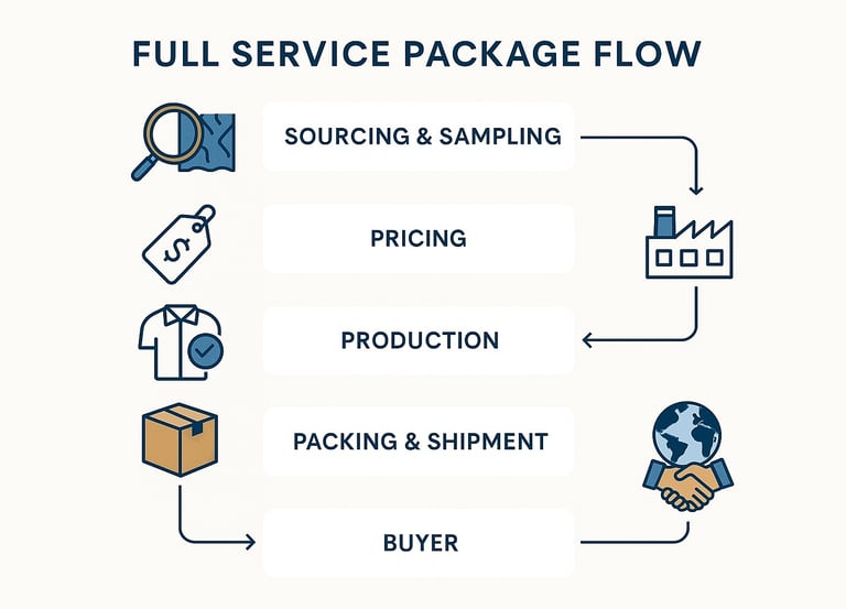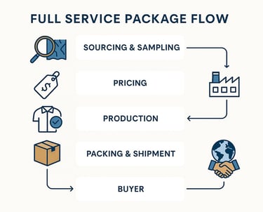 Our Commercial Department plays a pivotal role in ensuring the seamless execution of our "Full Service Package Flow," acting as the linchpin that connects every stage of the apparel journey to deliver exceptional value to our global buyers. Starting with Sourcing & Sampling, the Commercial Department collaborates with suppliers to secure the best materials, negotiating terms that align with client budgets. During the Pricing phase, their expertise shines as they craft competitive and transparent pricing strategies, balancing quality and cost to meet market demands. As we transition to Production, the department ensures clear communication between our skilled seamstresses—who transform fabric into stylish garments—and the factory floor, maintaining rigorous quality standards. In the Packing & Shipping stage, the Commercial Department oversees logistics, coordinating with forklift operators and shipping partners to ensure timely global deliveries, as symbolized by the airplane soaring overhead. Finally, their dedication culminates in the Buyer phase, where they foster strong client relationships, ensuring every order meets expectations and solidifies Attire Shine’s reputation as a trusted apparel sourcing partner.